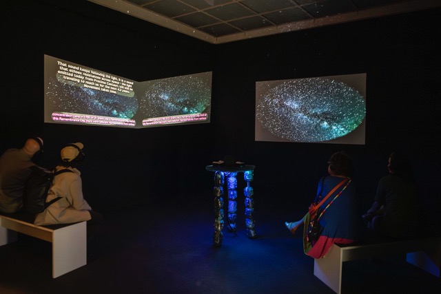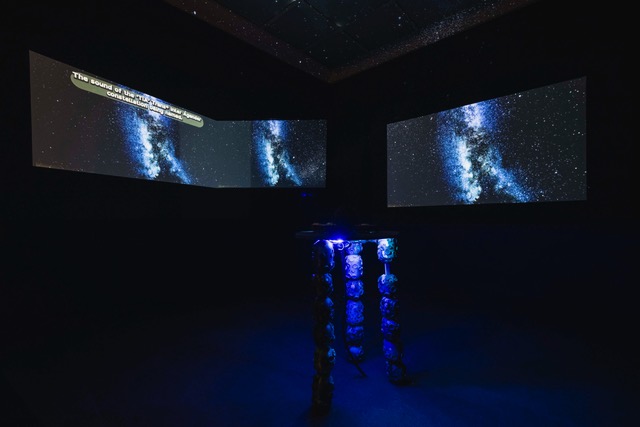 Engaging with the trans*feminist tradition of renaming structures, the work looks up to the starry sky and asks what it would be like if we renamed the constellations we have known since ancient times, whose names have almost exclusively masculine or patriarchal connotations: to the constellation of reparations or restitution or collaboration? These questions are engaged in the installation in a three channel video work. Engaging the aesthetics of access, the work uses subtitles, audio descriptions, and access copies as formats that center disabled, non-normative and neurodivergent modes of perception. In the center of the room, there is a dreaming table, inspired by planetarium projection machines and on the wall a tactile star map, allowing visitors to feel the night sky over Innsbruck during the exhibition period. The map can be taken away by visitors to draw their own new constellations.